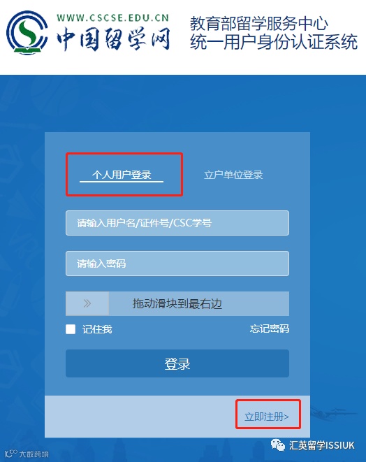 登录教育部留学服务中心网上服务大厅首页,点击页面上方登录。进入统一用户身份认证系统界面,选择个人用户登录,点击立即注册。
