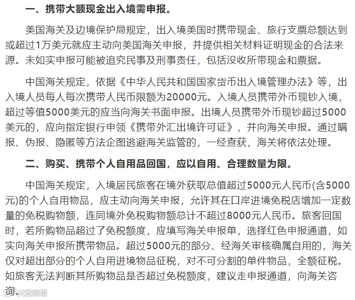 2019年中国驻纽约领事馆曾经发布提醒,中美两国海关对携带现金、礼品出入境有相关规定,建议大家如果需要回国,事先了解清楚,避免不必要的麻烦和经济损失。
