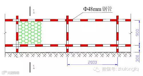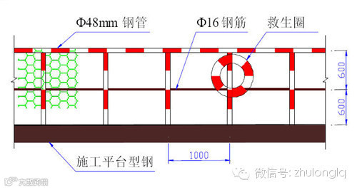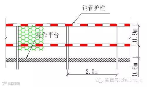 1、沿施工平台周边设置1.2m高栏杆,采用Ф48 mm的钢管焊接,立柱间距1m,与平台型钢牢固焊接,并外挂防护网。