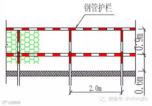 2、四周设防护栏杆,栏杆高1.2m、750px两道,立柱间隔2m,外挂安全网和彩旗,并设置安全警示标志,黄底红字。