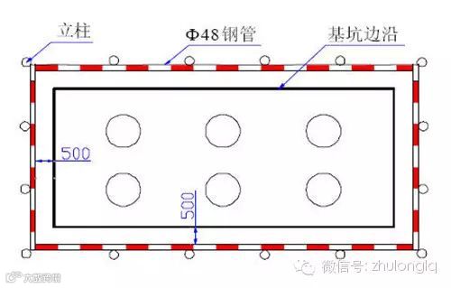 2 、基坑周边外0.5m处设置1m高防护栏杆,立柱间距2m,外挂安全网;基坑旁设置警示牌。