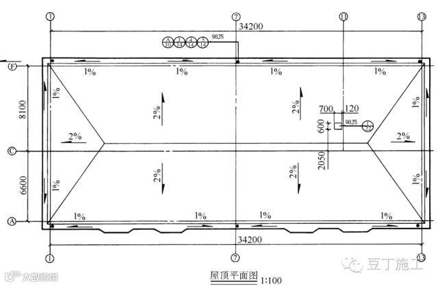 屋顶平面图主要反映屋面上天窗、水箱、铁爬梯、通风道、女儿墙、变形缝等的位置以及采用标准图集的代号、屋面排水分区、排水方向、坡度、雨水口的位置、尺寸等内容。