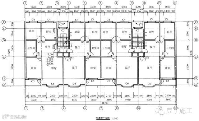 为了简化作图,已在底层平面图上表示过的内容,在标准层平面图和顶层平面图上不再表示。