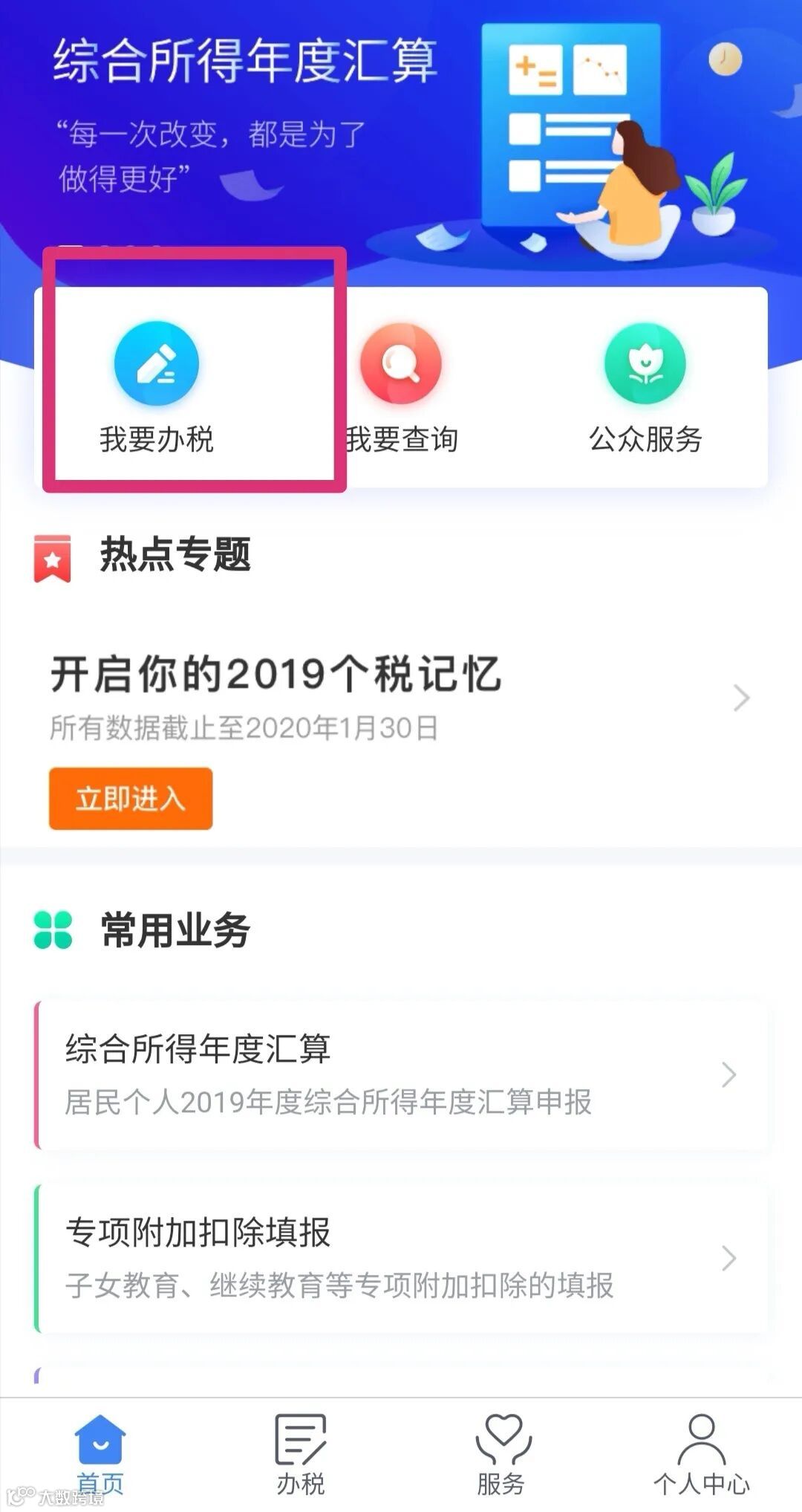 第一步:首先需要在应用商店里下载“个人所得税APP”,其次,没有填报2019年获得证书信息的需要先填报信息--打开个人所得税app--选择我要办税。