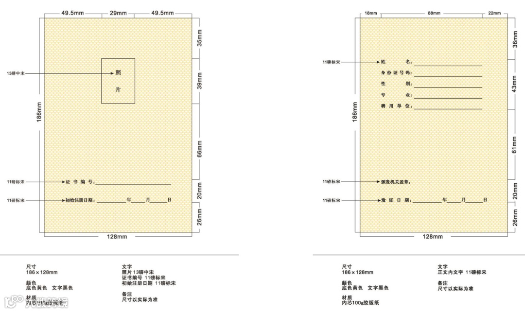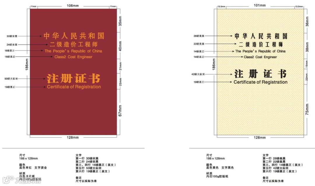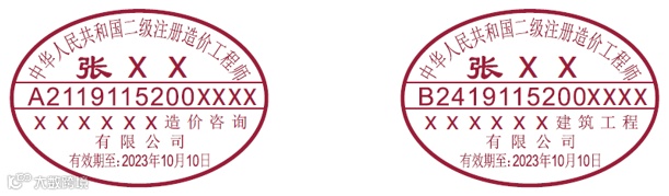 (三)造价工程师执业印章的字体要求:造价工程师注册级别为四号宋体,姓名为二号隶书,执业印章编码为小三号Arial字体,聘用单位名称及印章的有效期为小五号宋体;