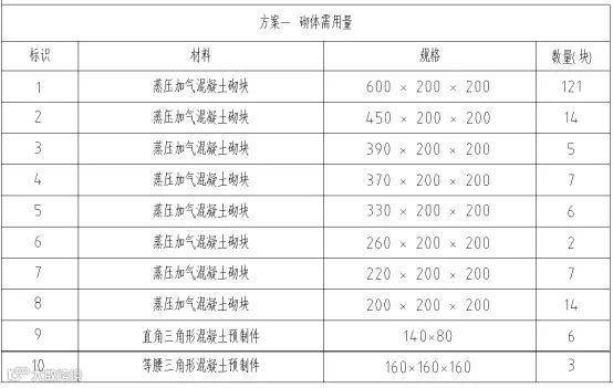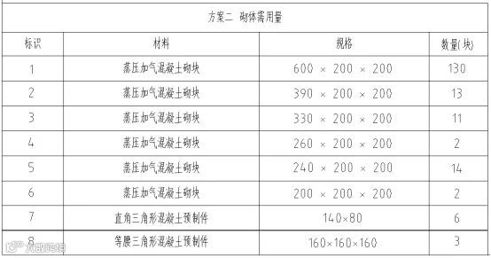 在满足砌筑规范的前提条件下,通过BIM技术对本项目砌体工程进行砌块排砖布置,获得多个排砖方案。以某一墙体为例,构造柱、砌块、门洞口、过梁等布置以及材料用量如下图所示,方案二相比方案一,其构造柱布置美观、砖尺寸种类较少、切割量少,降低了材料损耗率。