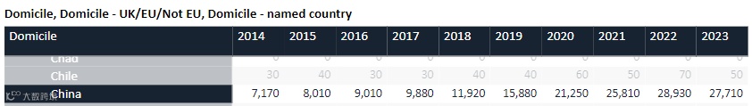 虽然相比22年申请人数略有2.3%的回落,但中国依然是海外申请人数最多的地区,超过欧盟国家总申请人数。