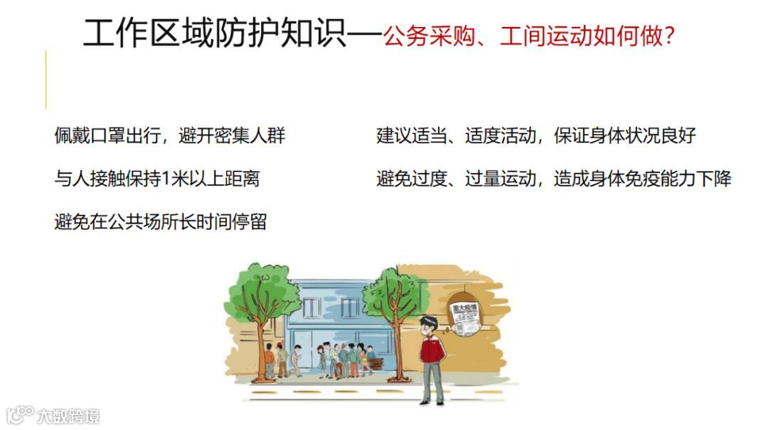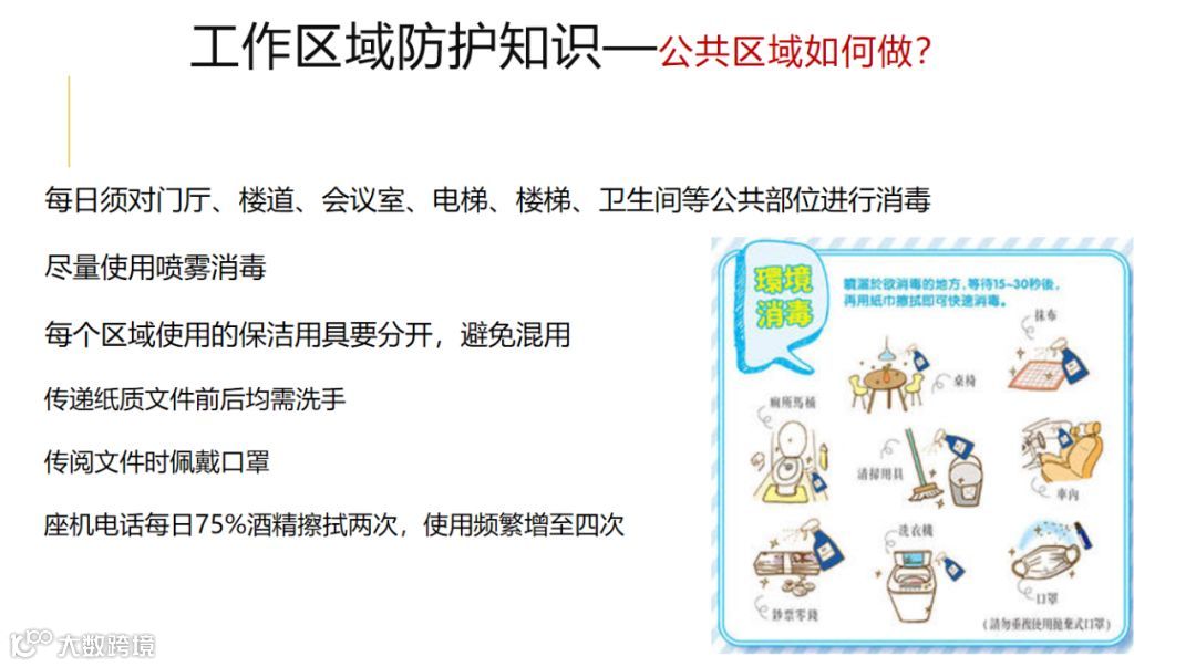 保持办公区环境清洁,建议每日通风3次,每次20-30分钟,通风时注意保暖。人与人之间保持1米以上距离,多人办公时佩戴口罩。保持勤洗手、多饮水,坚持在进食前、如厕后按照六步法严格洗手。接待外来人员双方佩戴口罩。