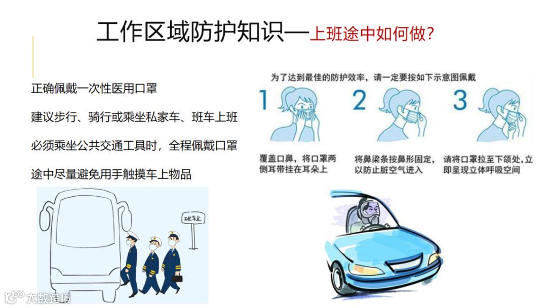 正确佩戴一次性医用口罩。尽量不乘坐公共交通工具,建议步行、骑行或乘坐私家车、班车上班。如必须乘坐公共交通工具时,务必全程佩戴口罩。途中尽量避免用手触摸车上物品。