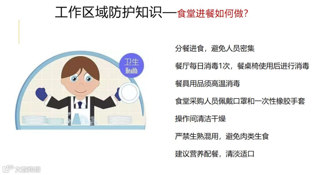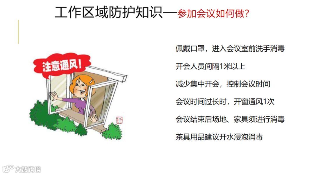 建议佩戴口罩,进入会议室前洗手消毒。开会人员间隔1米以上。减少集中开会,控制会议时间,会议时间过长时,开窗通风1次。会议结束后场地、家具须进行消毒。茶具用品建议开水浸泡消毒。