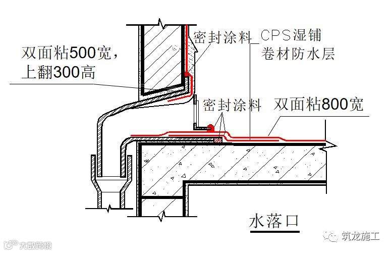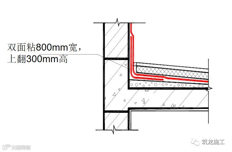 5)、卷材沿立面墙,上翻300高,此位置用宽度为800MM的双面粘折成直角铺贴,水平面的反应粘压住双面粘。