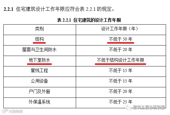 规范条文2.2.1规定住宅建筑设计工作年限应符合:结构不低于50年,屋面与卫生间防水不低于20年,地下室防水不低于结构设计工作年限(即:不低于50年)。