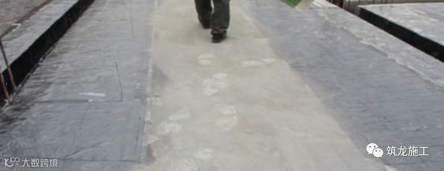 d.为了防止卷材粘脚,可在卷材面上撒水或水泥干粉作隔离措施。