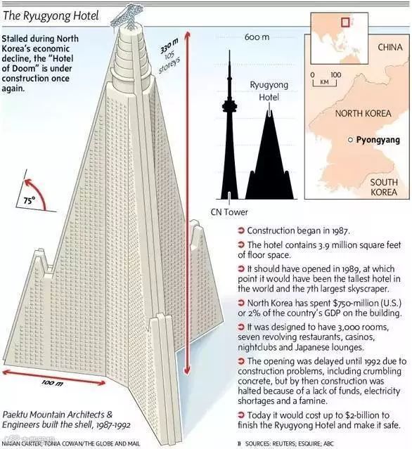 80年代的朝鲜经济一副欣欣向荣,政府拿出了当年GDP的2%,猛砸7.5个亿来建造柳京饭店!
