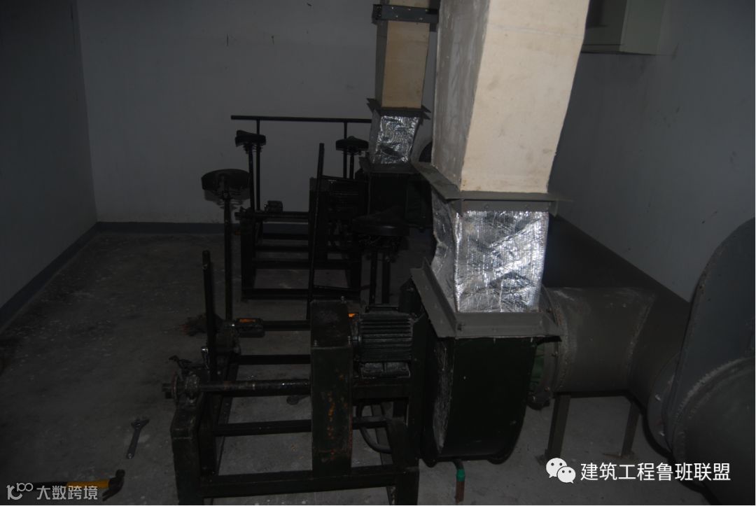 4)脚踏风机声音异响,运行不畅,连接处未垫橡胶圈,连接处漏风,支架固定不牢固,过滤吸收器与管路连接处未采用橡胶软接头,风机出风口风管弯头未安装。