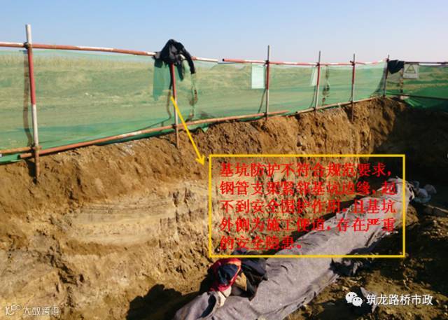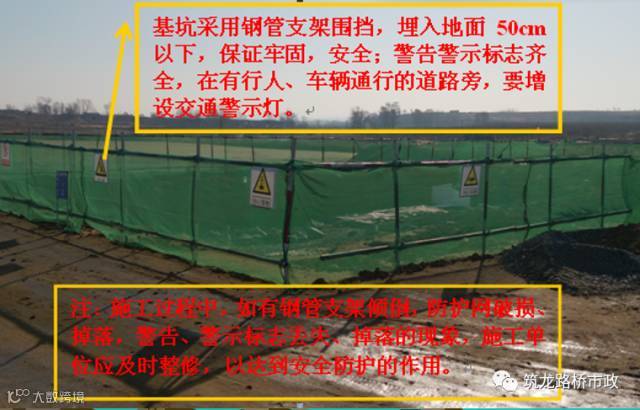 4 基坑应进行安全围挡,并悬挂警示标志。围挡可采用单排钢管支架围护安全网的方式,钢管应打入地面以下50cm深,钢管位置距离基坑边缘至少1m,受地形限制时可以稍窄,但不得小于50cm。