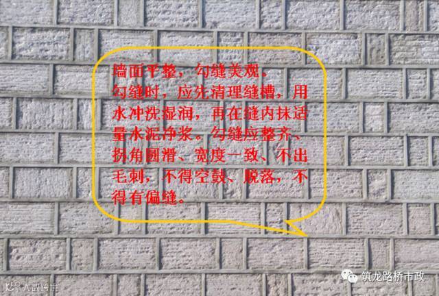 3.2 勾缝前,先清理缝槽,用水冲洗湿润,再涂抹砂浆。勾缝应整齐、拐角圆滑、宽度一致、不出毛刺,不得空鼓、脱落,不得有偏缝。水平缝与竖直缝应深浅一致、密实光滑,搭接处平整,不能有丢缝、瞎缝现象。