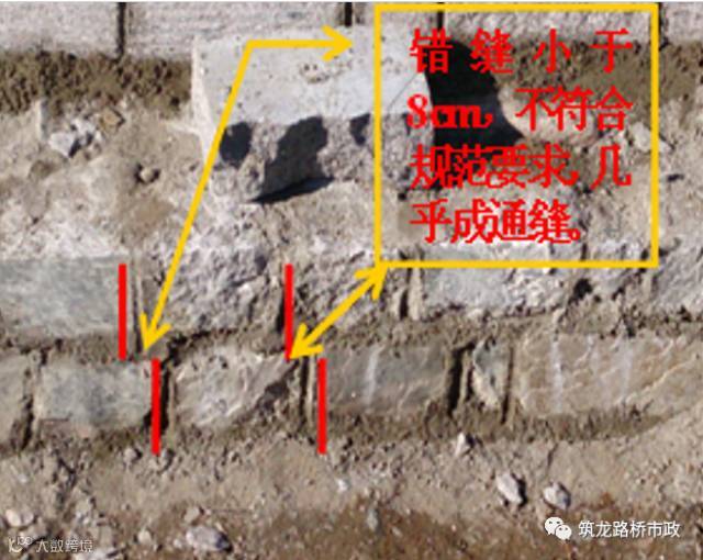 2.3 外层角隅石和镶面石要丁顺相间地与里层砌块立交接成一体,上下层石块也应交错排列,避免竖缝通缝。上下层砌缝错开距离原则上不小于8cm。