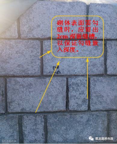 3.1 采用勾平缝的方式,砌体外露面预留深2cm的勾缝槽。勾缝采用设计的水泥砂浆,嵌入砌缝内约2cm。