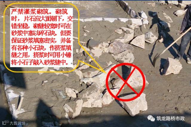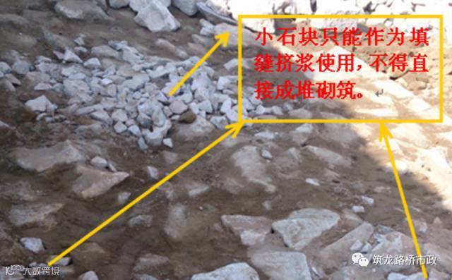 2.2 砌筑腹石时,较大的石块应使用于下层,石块大面朝下,坐稳放牢,砂浆饱满。石块之间均要有砂浆隔开,不得直接接触,竖缝较宽时可在砂浆中塞以小石块。石块要相互错叠、犬牙交接,上下层交接一体。现场的小石块,作挤浆填缝使用,挤浆时可用小锤将小石子敲入填满砂浆的缝中。严禁摆放石块,灌浆砌筑。