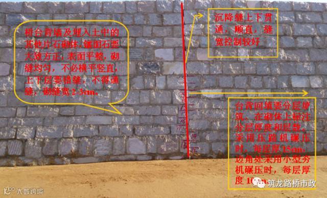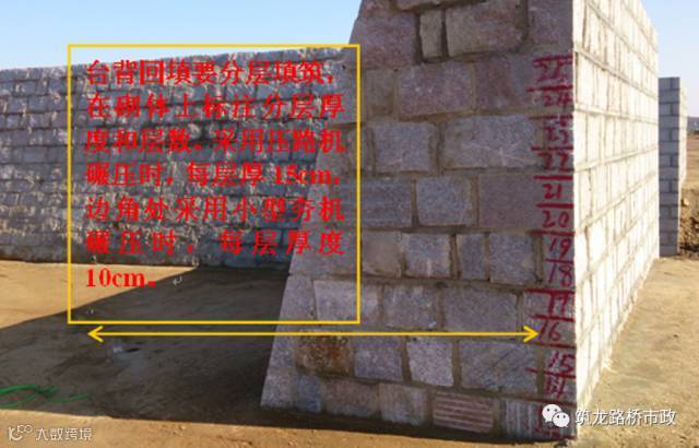 3、回填时,要严格分层回填,首先应把原地面平整夯实,再在砌体左、中、右位置上刻画分层厚度和层数,进行编号,以控制填筑厚度。在与路堤交界处应预留台阶,台阶宽度应不小于2m,台阶高度应不大于1m,内倾2%-4%。