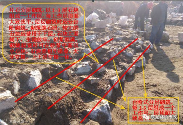 2.1 砌筑采用坐浆挤浆的方法,分层砌筑。每层应先砌筑外圈角隅石、镶面片石/块石,再砌筑里层帮衬石,最后砌筑腹石。镶面石、帮衬石和腹石要相互咬合、搭接,形成一体。