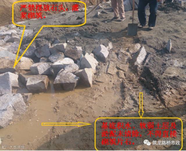 1.2 片石:厚度不小于150mm,不得采用裂纹、风化石、山皮石。片石要有平整面,棱角分明。不得采用无棱角,尺寸超小,薄片状,浑圆状石料。用作镶面的片石,表面要大致平整,边角方正,厚度不小于15cm,达不到要求的要进行加工修饰。