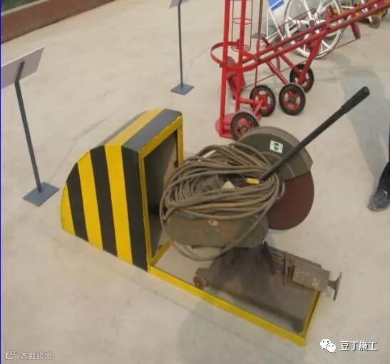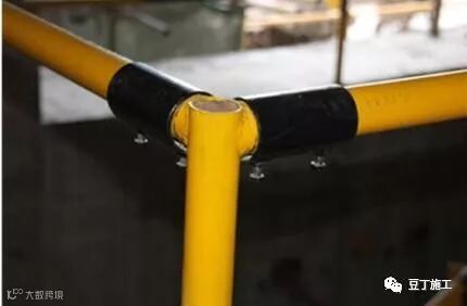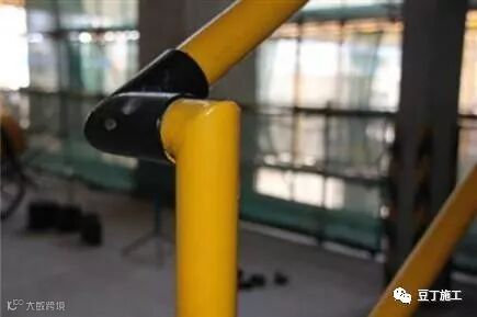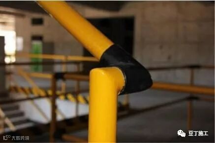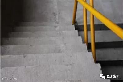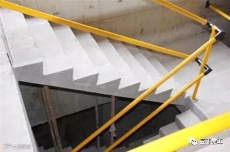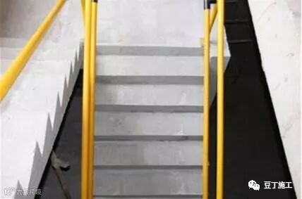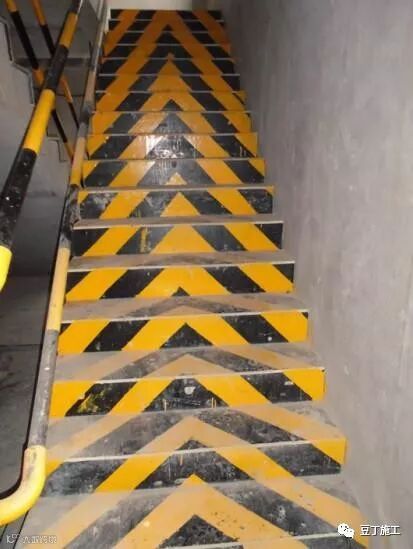 楼梯踏步护角采用废旧模板制成,并涂刷黄黑相间油漆。