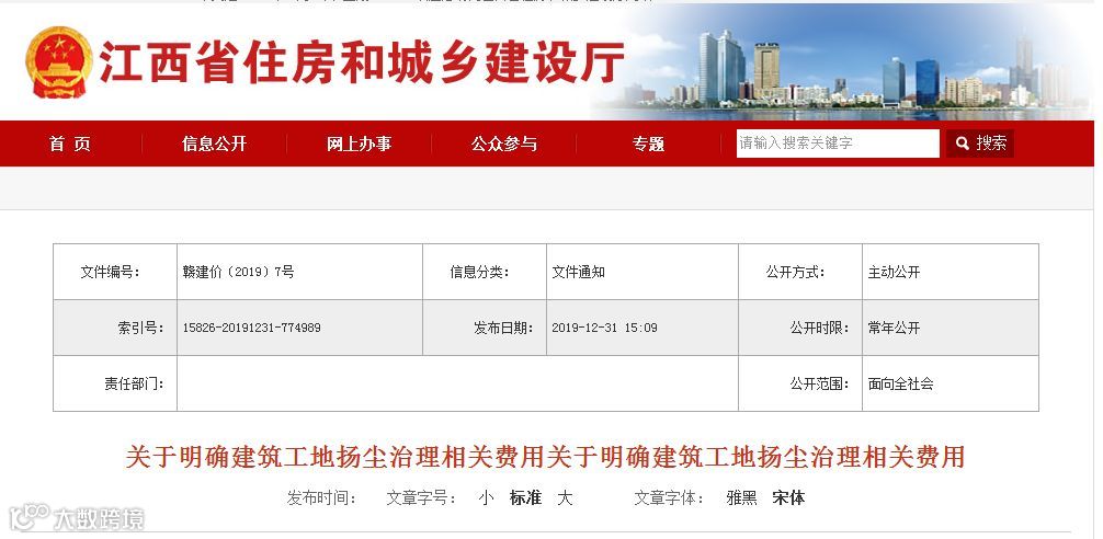 近日江西省住建厅发布关于明确建筑工地扬尘治理相关费用的通知: