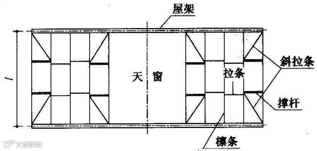 (3)当屋盖有天窗时,应在天窗两侧檩条之间设置斜拉条和直撑杆(图3-15)。