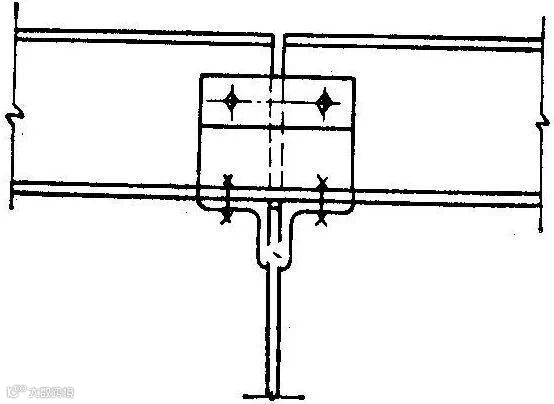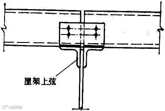 实腹式檩条通过檩托与屋架上弦连接,檩托用短角钢做成,先焊在屋架上弦,屋架吊装就位后用螺栓或焊缝与檩条连接(图3-10)。