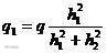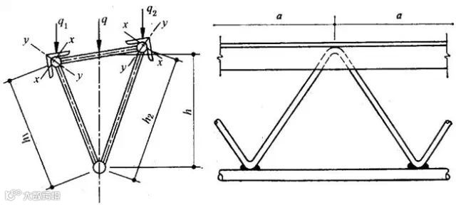 空间格构檩条将空间桁架分解为高度等于h1和h2的两榀平面桁架进行计算,两榀桁架的荷载分别为q1和q2,其值可根据总荷载按刚度进行分配(图3-13):