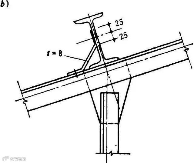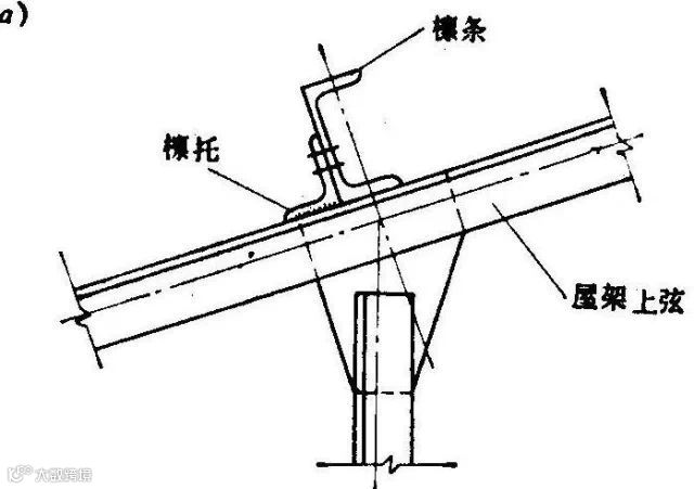 (4)角钢檩条在天窗两侧用斜拉条固定于屋架上,在屋檐处要设置斜拉条,以防角钢檩条向上倾覆。