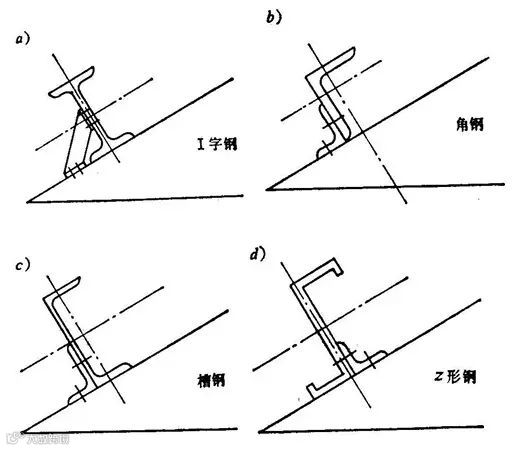 实腹式檩条:构造简单,制造及安装方便,常用于3~6m的跨度。截面形式:普通工字钢(因较重、不易安装,用的不多)、角钢(用于荷载跨度小的屋盖)、槽钢(常用)和Z形(为冷弯薄壁型钢、省钢)(图3-9)。檩条的截面高度取决于跨度、檩距和荷载大小等因素,一般取檩条跨度的1/35~1/50。