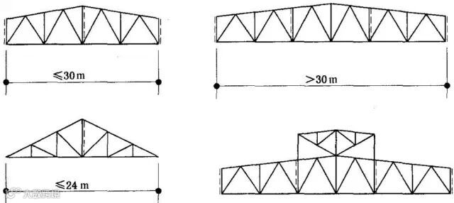 当高度较小时,可用V式及W式斜杆(图3-7c,d),弦杆与斜杆间的交角为30°~60º。
