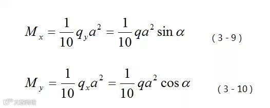 垂直于屋架坡度放置的檩条,在竖向荷载作用下,两个主轴方向分别受到qx和qy作用(图3-11)。按简支梁计算,两个方向弯矩为