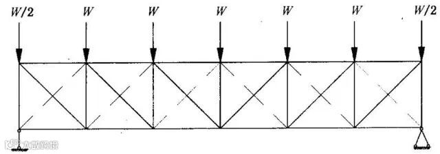 平面格构檩条可按静定的平面桁架计算,各节点均假定为铰接。计算时,将上弦的均布荷载换算成节点荷载,结构力学方法计算杆件轴力,一般只需计算最大内力,即跨中上、下弦杆内力和支座处的腹杆内力。