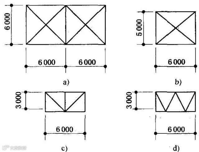 纵向水平支撑桁架的节间,以组成正方形为宜,一般为6m×6m,或长方形,如6m×3m。横向水平支撑节点距离为屋架上弦节点距离的2~4倍。垂直支撑的腹杆形式可根据桁架的宽高比例确定。