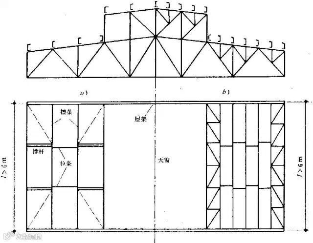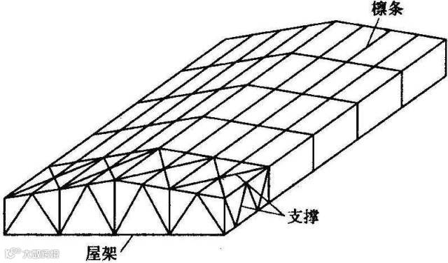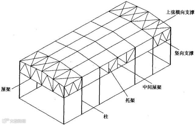 屋架——屋盖的主要承重结构。需要用支撑连接屋架。长的屋盖结构,在中间设置横向支撑。