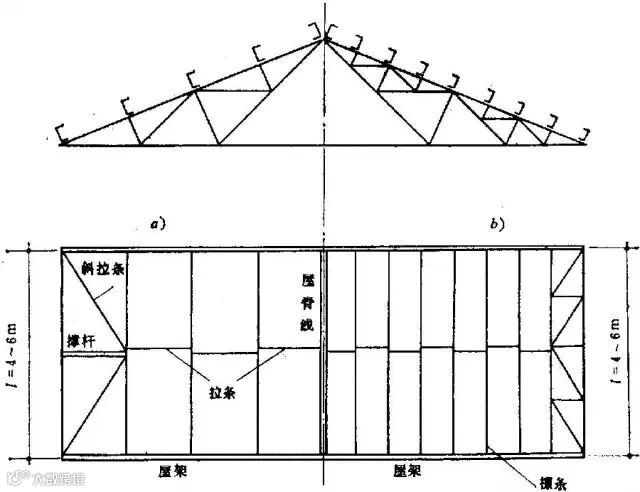 有檩屋盖:当屋面采用轻型材料如石棉瓦、瓦楞铁、压型钢板和铁丝网水泥槽板等时,屋面荷载要通过檩条再传递给屋架(图3-3)。