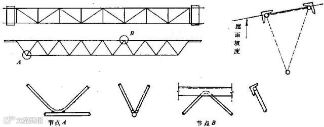 下弦为抛物式檩条,中间节间必须设置斜杆,以防止檩条上弦在不对称荷载作用下产生过大的局部拱曲。