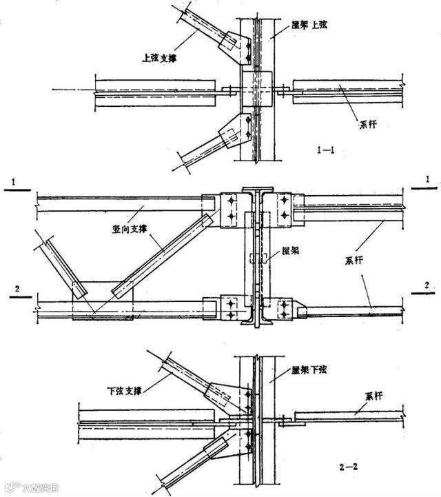 横向支撑——屋架弦杆的侧向支承点,减小弦杆在平面外的计算长度,减小动力荷载作用下的屋架平面外的受迫振动。