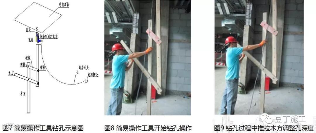 采用简易操作工具十分方便,缩短了钻孔打眼的时间,同时施工人员直接站在楼板上,可以方便移动,减小了与其他专业施工时相互之间影响,避免发生事故,不仅省时省力,还保证了施工人员的安全。本施工技术受到工人、业主、监理、各级建设监督部门的认可。在实际施工中在技术方面简单易行,具有广泛的推广使用前景。