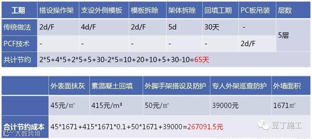 工期节约:因为PC板前期在加工厂预制加工,相应的缩短了工期。按传统每层搭设操作架需2d/F,支设外侧模板4d/F,按5层算,共节约工期30天。模板拆除2d/F,架体拆除5d,共节约工期15天。此外由于使用了PC板填充了建筑红线间隙,省去了回填的时间,节约工期30天。考虑PC板吊装需2d/F,累计节约工期65天。