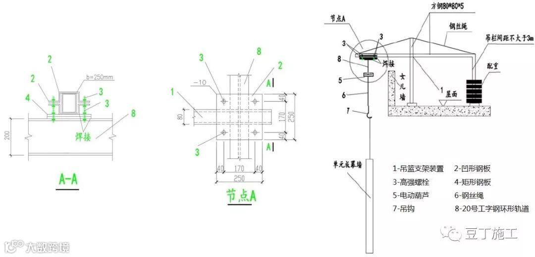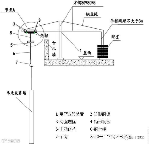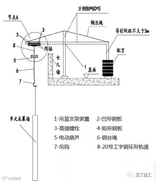 该方法构造简单、安全可靠,无需塔吊或悬臂吊等机械提升设备,幕墙施工过程中无需搭设脚手架,大大节约了材料成本,提高了单元板幕墙的吊装效率。
