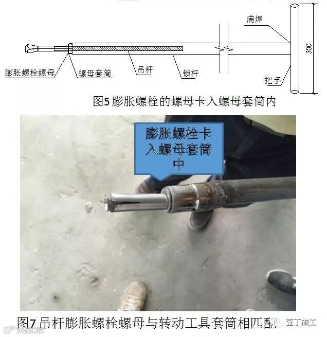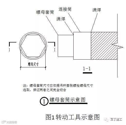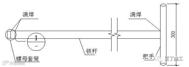 转动工具前端需焊接一个连接筒将螺母套筒和转动工具相连,焊接应满焊,焊缝应饱满,转动工具下方为长度300mm的水平钢管把手,通过焊接与转动工具连在一起。