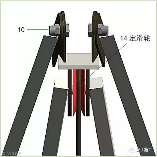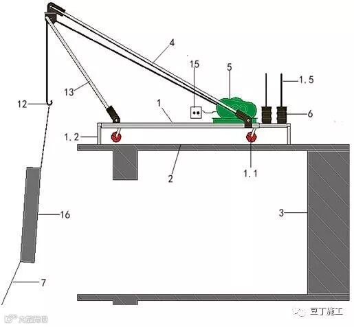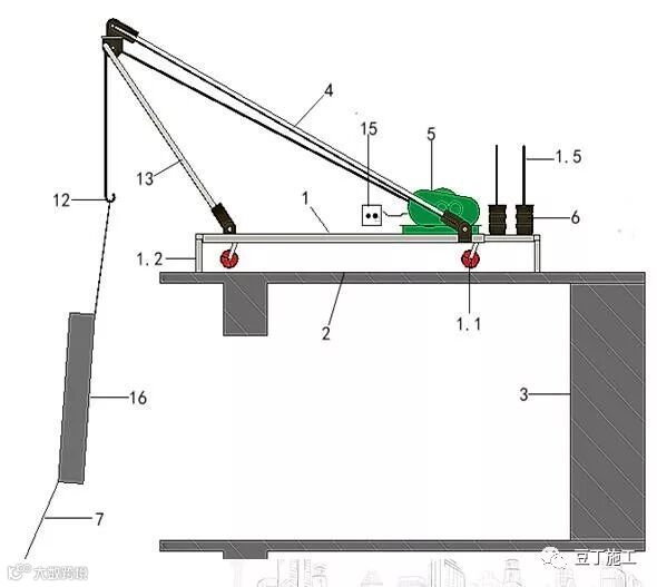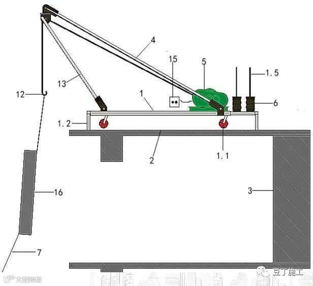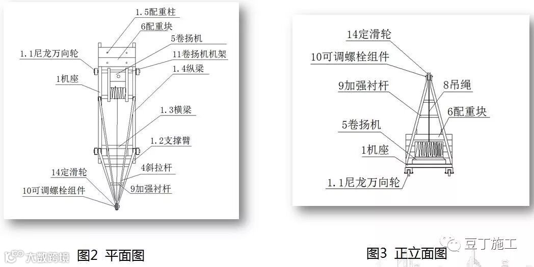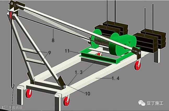 本装置主要是用于叠拼别墅,施工时,外立面及内部装饰材料的吊装,并可推广至穿插整个工程的小型货物吊装作业。