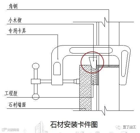 上一层石材安装完毕后,方可安装第二层石材,上下两层的操作时间间隔应在1小时以上。如果操作面不长,为提高工效,可在下层板上用快干型环氧树脂AB工程胶进行至少两点加固,每个加固胶粘结点面积不小于2cm.