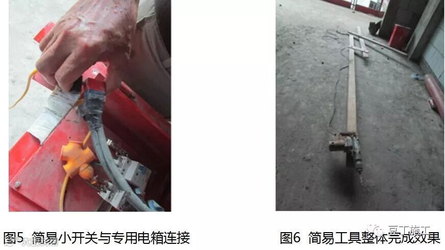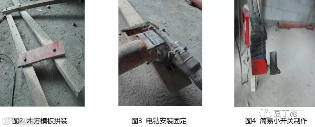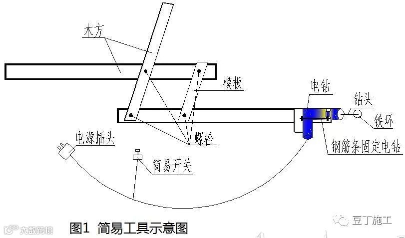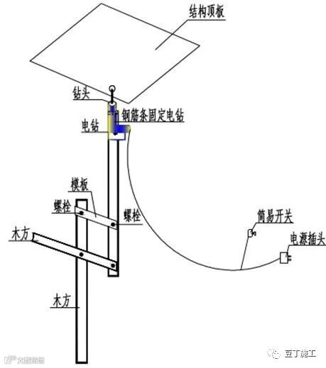 钻孔施工前需要利用手提式电钻(钻头根据现场植入钢筋直径确定)、木方(可根据实际情况确定)、4颗8mm螺栓、三根直径为20mm钢筋条、一圈黑色胶带、自制安全简易小开关等制作一款简易操作工具。