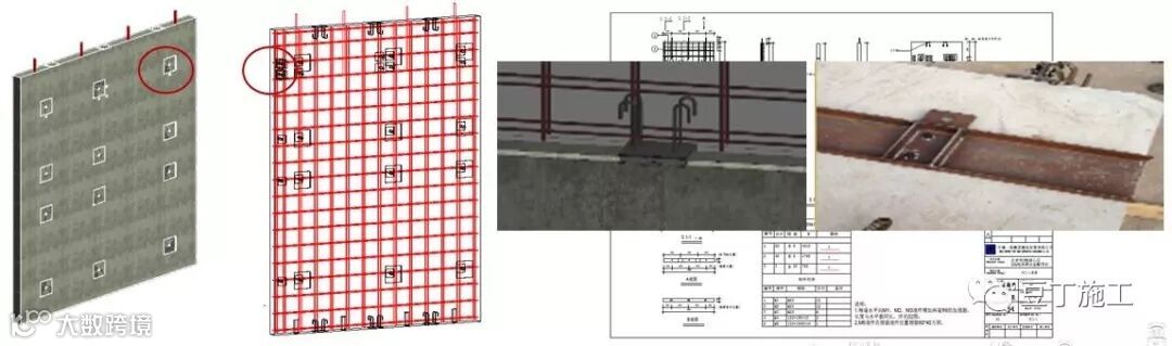 二、预埋件的深化设计,首先要考虑板的分割尺寸,避开钢筋甩茬位置并匹配塔吊的吊重和吊次,方面施工。其次深化以下几个预埋件的大小与位置,1、与止水对拉螺栓固定的内部的预埋件;2、底部和顶部预埋PC板与PC板连接埋件,3、上部预埋PC板与可调斜撑槽钢连接埋件,4、PC板拼缝位置的预埋钢板。通过BIM建模,对埋件埋设位置和连接方式进行二次深化,避免埋件和钢筋的碰撞冲突。
